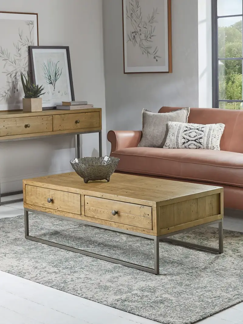 Rustic charm radiates from our Lima coffee table. The reclaimed wood creates a bold and unique appearance with each piece, whilst the sleek metal legs add a touch of elegance. With two drawers and plenty of tabletop space for your favourite books and plants, our Lima coffee table is ideal for a home with a soft spot for the industrial.Explore the rest of our Lima collection here.