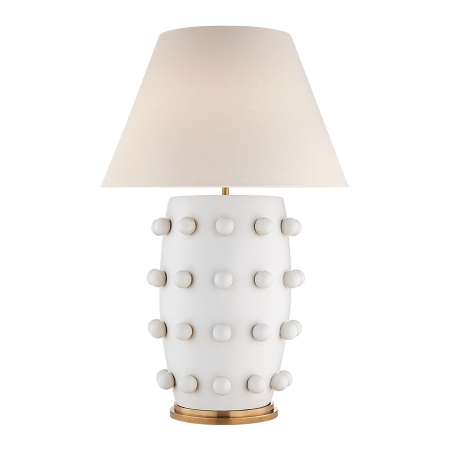A matte white table lamp decorated with white bobbles, a large linen shade and antique brass fixings. Linden, crafted by the iconic designer Kelly Wearstler, adds unique character to a room in the shape of humour, texture and funky form. Available in two sizes. Linden Table Lamp White, Table Lamp, Medium, Plaster White - Andrew Martin