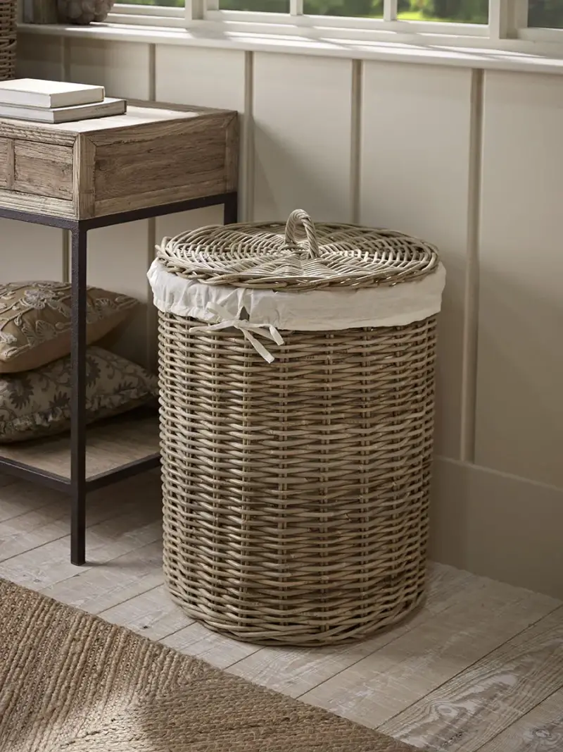 Keep your laundry neat and tidy in this round woven laundry basket in a light rattan. With a soft cotton lining and a rattan handle to lift the lid, this laundry basket will fit into your bathroom, bedroom or hallway perfectly.