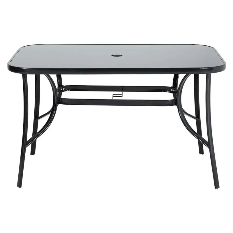 Stylish and classic black appearance, simple and unique style, this black screen-printed square table will look great in any garden or terrace area, adding a modern touch to your outdoor space. Made of 5mm toughened glass and a durable metal frame, it provides you with stability and safety. Features and Benefits Made of tempered glass and premium iron tube A sleek and smooth surface provides a safe and good touching feeling The table has a hole in the middle of the tabletop for Parasol Weather-resistant design can be used indoor and outdoor Ideal for gardens, yards, patios, and balconies Specifications Guarantee: 12 Months Material: Tempered Glass Model Number: LG0889 Self Assembly Required: Yes Dimension: 120cm W x 80cm D x 70cm H Table Colour: Black Tabletop Material: Tempered Glass Frame Material: Metal Table Shape: Rectangle Table Type: Unfoldable With Umbrella Hole: Yes Umbrella Hole Diameter: 51mm