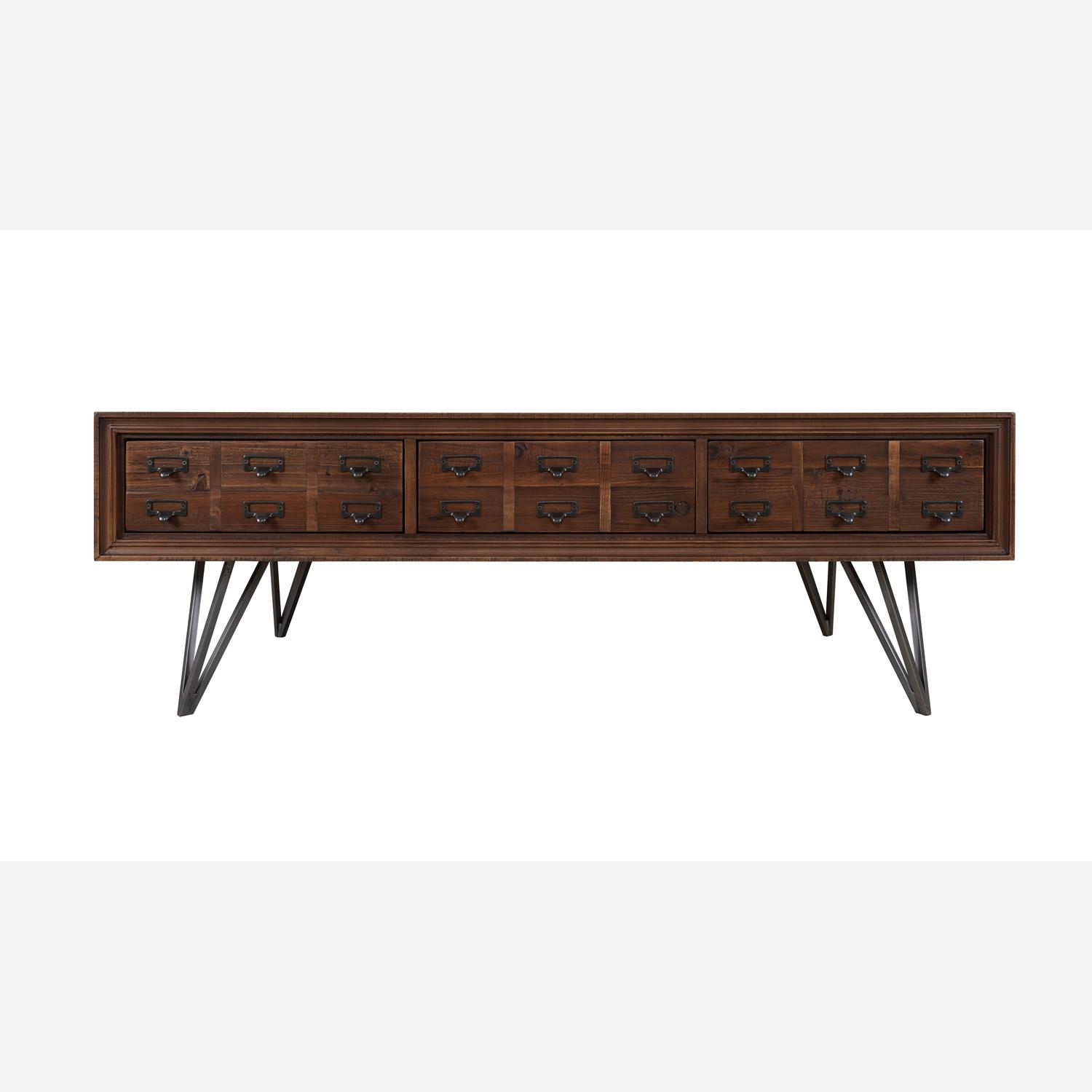The Lloyds Coffee Table combines reclaimed wood and industrial iron, featuring three drawers for storage and a unique design that adds warmth and functionality to your space. Lloyd Coffee Table, Coffee Table - Andrew Martin