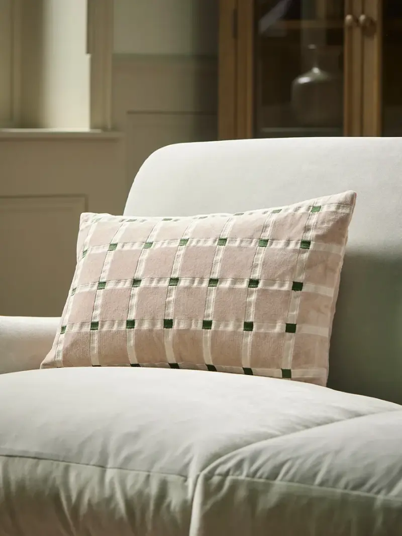 Our Lola Velvet Cushion features a geometric latticed design on soft taupe velvet, accented with fresh green highlights. Its oblong shape makes it an elegant addition to any bed or sofa, adding a touch of luxury to your space. Also available in Vintage Rose.