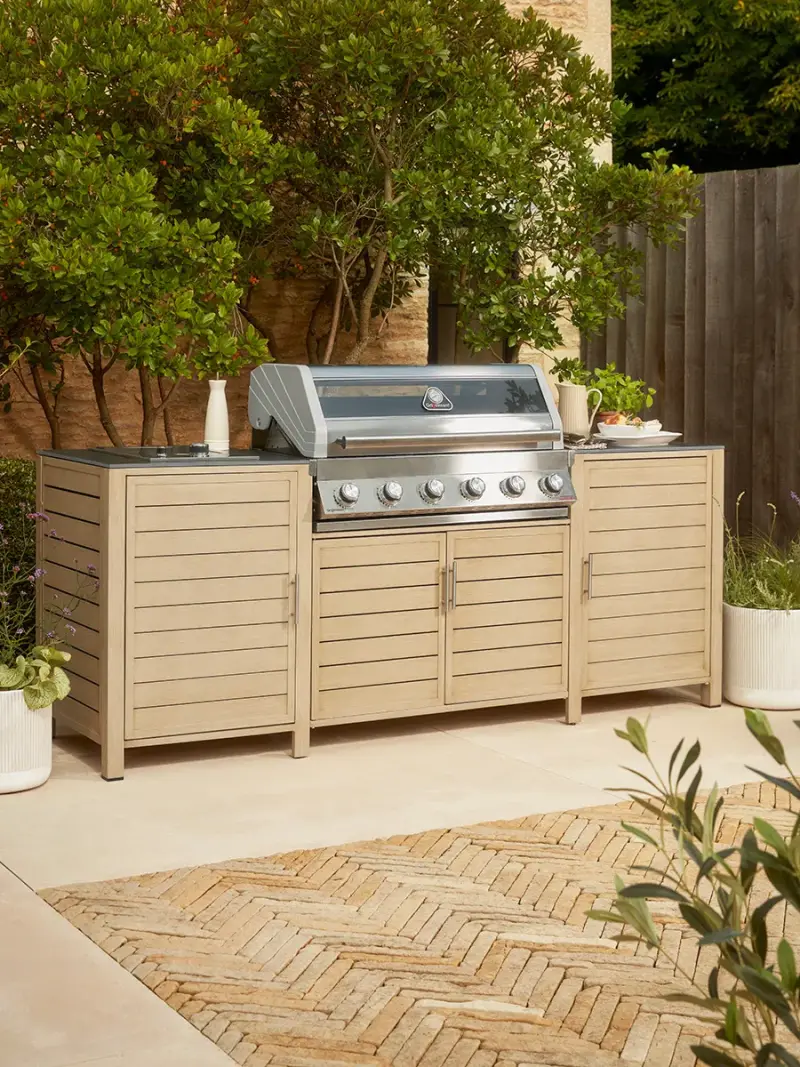 Create an instant outdoor kitchen with our Long Island BBQ and integrated storage cabinet which will transform your outdoor living, all year round.The technology of our Long Island six burner hybrid BBQ offers everything for the discerning chef who likes creative cooking outdoors integrated with a stunning range of outdoor kitchen units.Enabling you to keep all the utensils, pans and crockery you need close to hand, you'll be even more enthusiastic about the spontaneity with which you can cook and serve a delicious al fresco feast.The attractive slatted cupboards are actually made from aluminium which has been handpainted to create a realistic wood grain effect. A scratch resistant coating makes it even tougher.The barbecue itself has all the features of our Gourmet BBQ - the luxe stainless steel finish, glass viewing hood, LED control and integrated side ceramic sear burner shelf.A modular system also allows you to remove the circular griddle in the middle of the grill to add a pizza stone or wok stand.Grillstream technology offers a double grill system whereby the top grill streams away most of the fats and juices that would normally cause flare-ups. Anything that drips over will collect in the bottom grill and is channeled into a collection cup ready for disposal - making for a much cleaner cooking experience.Our BBQ is contemporary and well formed, to sit effortlessly into your outdoor dining space. If, like us, you love to cook and entertain outside - take inspiration from Scandinavia and dine outdoors on even the coolest of days - the option of using gas or coals will allow all days to be catered for.Our Gourmet Gas & Charcoal Stainless Steel BBQ is fitted with a 27mm Propane regulator.