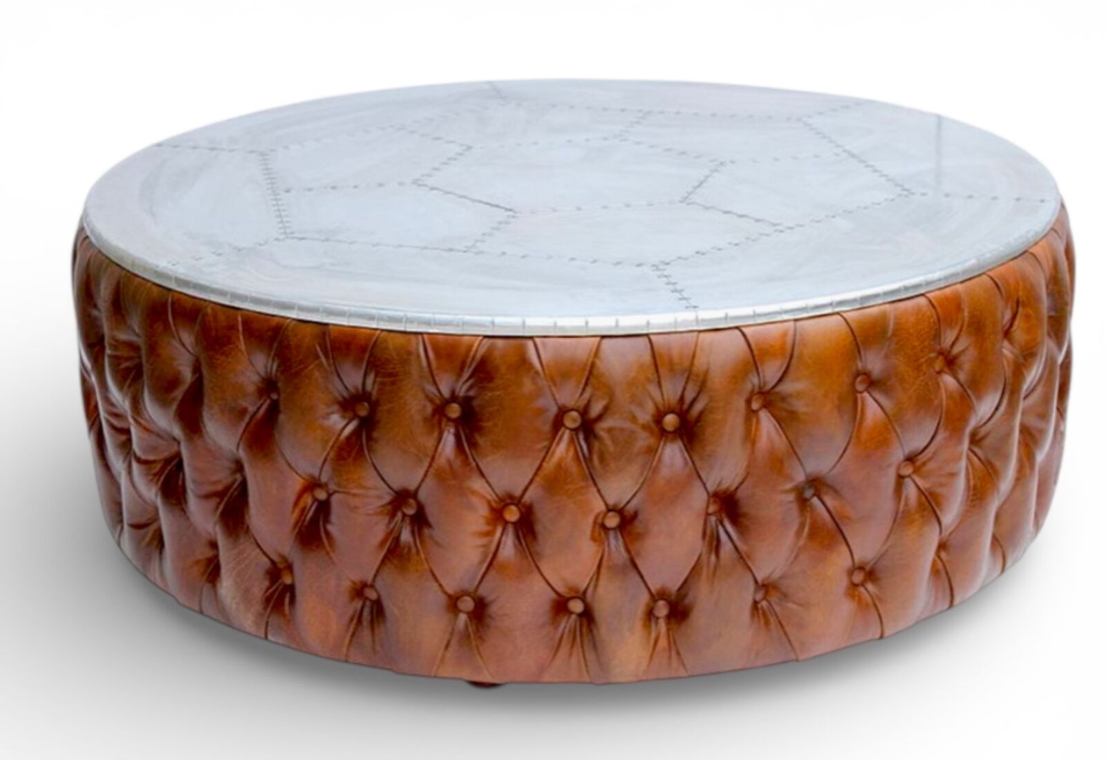 A bold fusion of comfort and industrial elegance. This oversized round coffee table features deep button-tufted leather upholstery paired with a sleek metal aviator tabletop, creating a functional centerpiece that doubles as seating and a designer focal point. Statement Design Sculptural round profile with classic chesterfield-style tufting Dual Function Works as a coffee table, cocktail table, or extra seating Premium Upholstery Rich, hand-finished leather with deep button detailing Durable Metal Top Smooth, structured surface for trays, d cor, and daily use Large Format Ideal for open living rooms, hotel lounges, and luxury interiors Dimensions (CM) Coffee table : L126 X W126 X H44 Apprx. What is Vintage Distressed Leather? The Vintage Distressed Leather Collection is meticulously crafted, perfectly preserves every inch of natural ageing marks, revealing not only the story of time but also the unique classic charm. Each piece is a Limited Edition Worldwide…