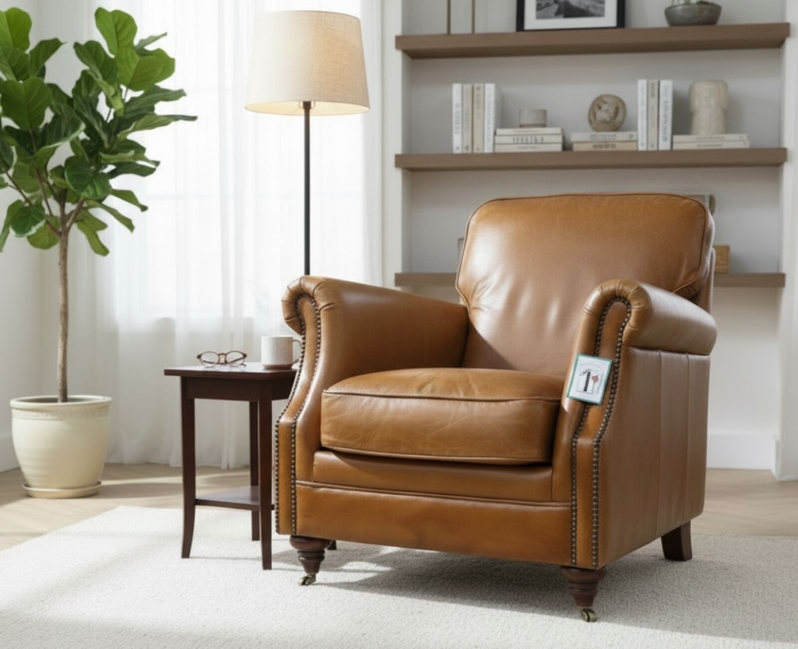 Elevate your space with this stunning vintage-style distressed leather armchair. Upholstered in rich, tan top-grain leather, this timeless club chair blends classic elegance with modern comfort. The rolled arms and hand-applied nailhead trim add a touch of sophistication, while the deep seat and plush cushions ensure maximum relaxation. Key Features: Premium distressed tan leather for a vintage look and feel Solid wood frame for lasting durability Rolled arms with antique brass nailhead accents Deep cushioned seat and padded backrest for superior comfort Smooth-rolling front casters for easy movement Ideal for living rooms, libraries, or stylish office settings Dimensions (CM) armchair L81 X W86 X H78 Apprx. What is Vintage Distressed Leather? The Vintage Distressed Leather Collection is meticulously crafted, perfectly preserves every inch of natural ageing marks, revealing not only the story of time but also the unique classic charm. Each piece is a Limited Edition…