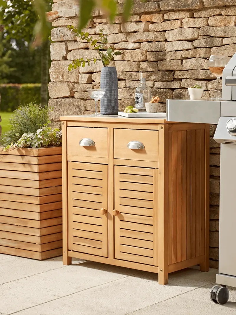 The Malmo Outdoor Storage Cabinet offers the perfect outdoor kitchen solution. Position this good-looking acacia unit on the terrace near your barbecue or firepit and you can have everything you need to hand. A sizeable stone tile top provides ample workspace for whipping up a marinade or prepping a salad. There are two deep drawers for stowing away utensils and cutlery and, inside the cupboard doors, two strong shelves for pots, plates and any other paraphernalia.