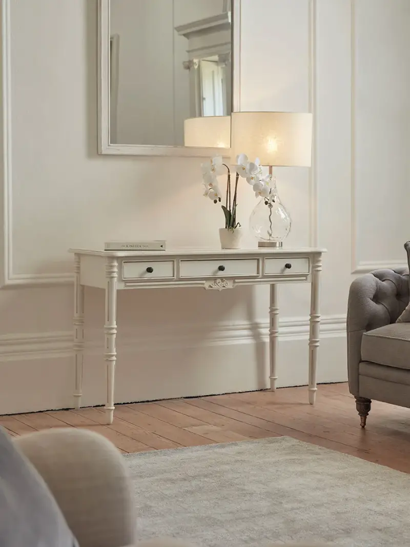 Intricately carved floral detailing to the front panel and elegantly turned legs give our Manon Console table all the character of a vintage piece.Made of mahogany, with a gently aged finish in white, this table will make a charming addition to any room. Three drawers run across the front of the console with contrasting dark wooden knobs, making it handy for keys and other small bits and pieces that gather in hallways.