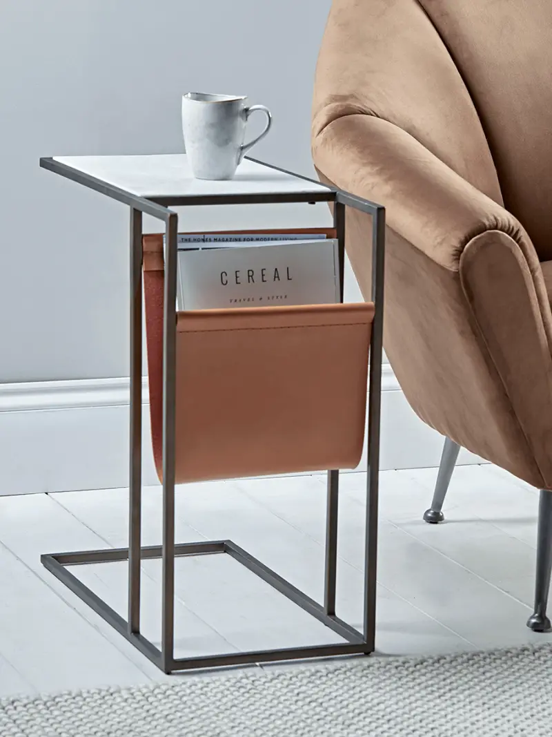 Crafted from an iron silhouette, this contemporary side table comes complete with a marble top and handy leather sling for storing all of your favourite magazines.
