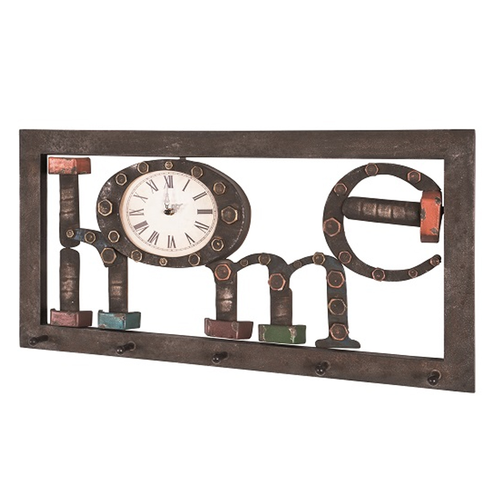 Marisa Home Coat Rack In Vintage With 5 Black Metal Hoooks And Integrated Clock with the writing Letter home perfect for your Hallway Room Finish: Vintage And Black Features: Marisa Home Coat Rack In Vintage With 5 Black Metal Hooks And Integrated Clock Vintage And Black MDF Vintage style 5 Metal Hooks in Black Writing Letter of HOME in Stylish way Integrated Wall Clock Perfect piece for your Hallway Available at an affordable Price Dimensions: Depth: 8cm Width: 70cm Height: 35cm