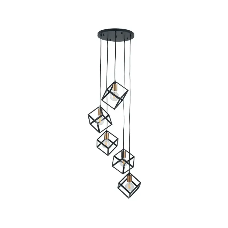Bring some modernist style in to your home with our Alessio five drop electrified pendant. Created from metal and finished in a contrasting matt black outer cube with a gold inner cube. This pendant when hung appears to be suspended in mid air creating a piece of art for your ceiling. Pair with our Calex bulbs to complete the modernist industrial look. Also available as a three drop electrified pendant and a single drop electrified pendant. Effortlessly hanging from your ceiling, this pendant light will help to illuminate your bedroom, dining room or living space. Specifications Colour: Black Length of guarantee: 12 months Material: Metal Type: Electrified Ideal for bedroom, dining room or living area Weight: 4.3kg ES/E27 GLS 60W 5 bulbs Dimensions: W50xD50xH156cm
