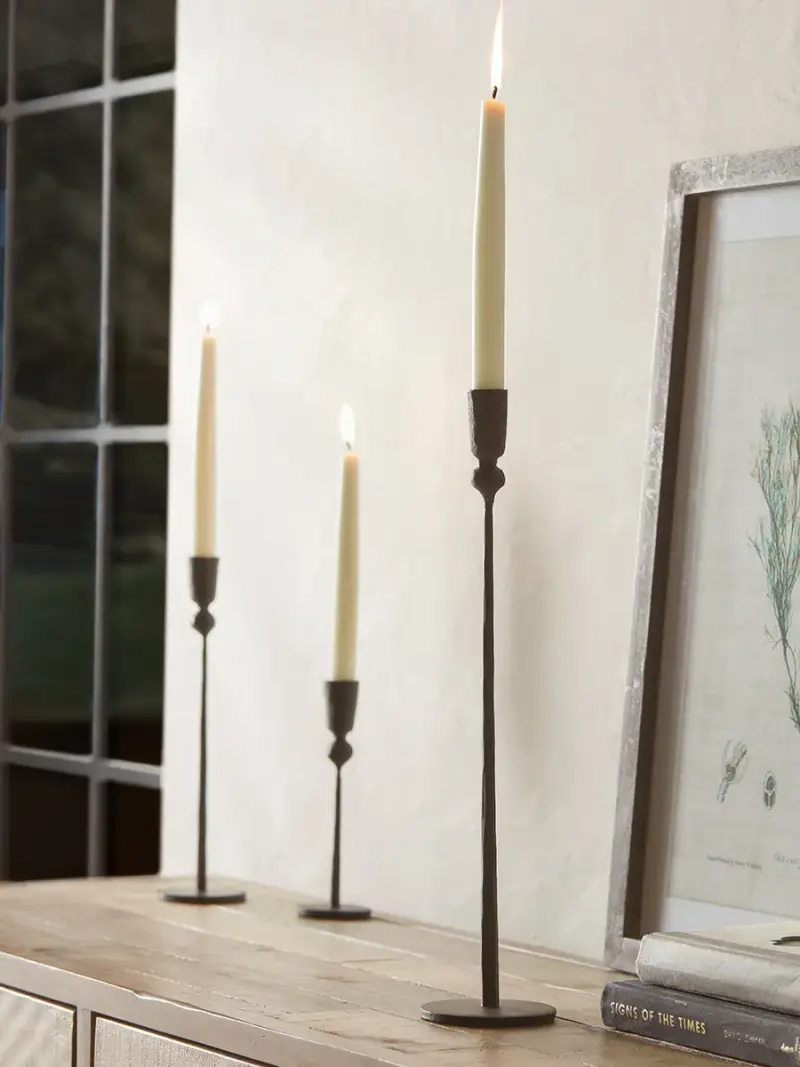 So simple and yet so enduringly stylish, our matte black dinner candle holders will make a timeless addition to your dining table, mantelpiece or indeed any position you fancy. Tall and elegant in stature, the rustic matte black highlights the hand forged markings which gives each candlestick its character. Available in three sizes, they look sophisticated in matched pairs or arrange a few of different heights for a more fluid look. Also available in medium and small.
