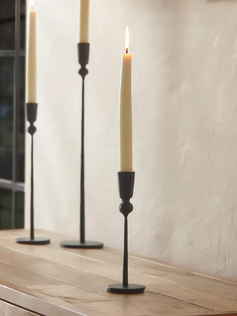 So simple and yet so enduringly stylish, our matte black dinner candle holders will make a timeless addition to your dining table, mantelpiece or indeed any position you fancy. Tall and elegant in stature, the rustic matte black highlights the hand forged markings which gives each candlestick its character. Available in three sizes, they look sophisticated in matched pairs or arrange a few of different heights for a more fluid look.Also available in medium and large.
