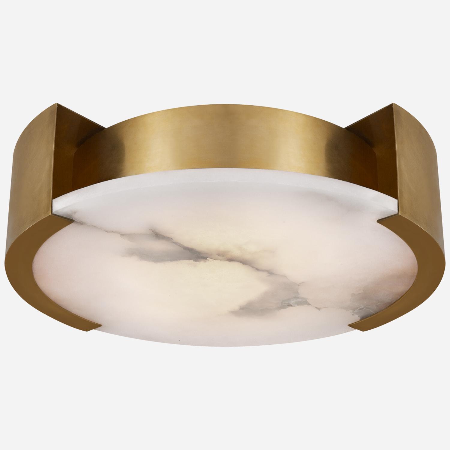 Flush mount in antique-burnished brass with alabaster Effortlessly pairing natural alabaster and sleek metal detailing in a streamlined geometric form, the Melange Flush Mount exudes a modern refinement while emphasizing the beauty of natural stone. This fixture features hand-carved natural alabaster with either Antique Brass or Bronze detailing and is rated for damp locations. NOTES: Due to the natural characteristics of our alabaster, each fixture is unique. Please also use LED bulbs only to prevent discoloration and to ensure your alabaster fixture remains beautiful.