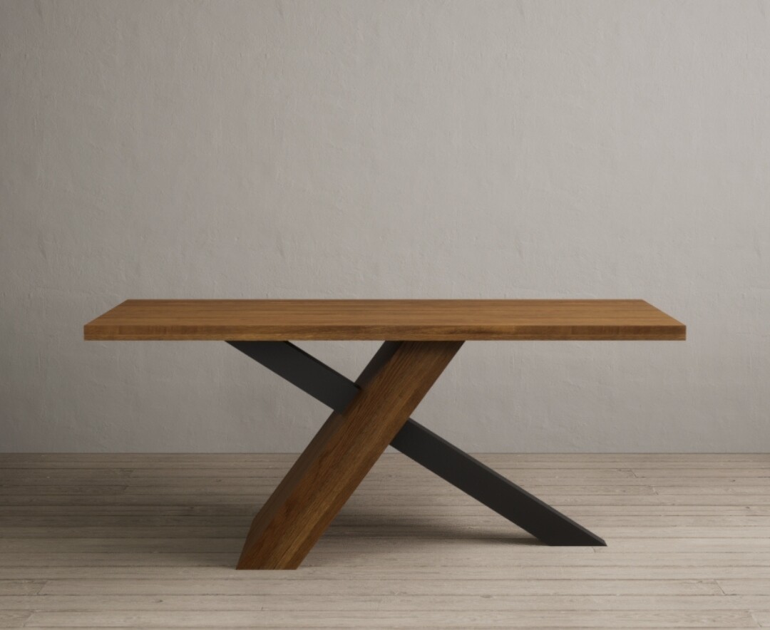 The striking Michigan table features a modern design, with a sturdy solid hardwood leg crossing with a sleek metal support beneath a thick rustic oak tabletop.