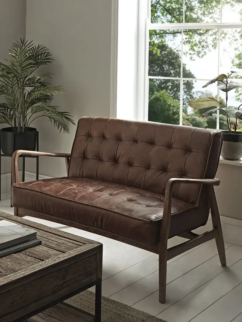 Stylish and sophisticated, our mid century style two seater sofa is complete with a classically designed ash wood frame and rich tan leather upholstery.Each sofa features a beautiful buttoned finish to both the seat and backrest for an added detail.