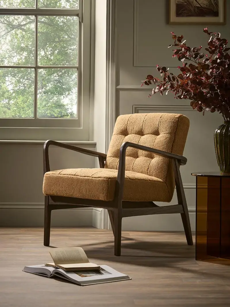 With a dark wood frame, this armchair brings mid-century charm to any home. Upholstered in a warm ochre fabric with a soft, teddy bear-style texture, this armchair is finished with buttoned detailing, giving the chair a luxurious and elevated look. Pair with the matching footstool, cushion and throw for the perfect cosy reading nook.