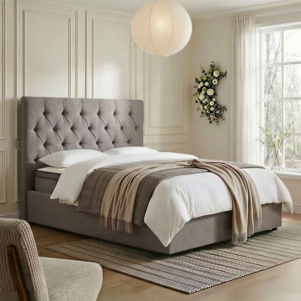 Upgrade your bedroom with the luxurious Furniture in Fashion Middleton Fabric Ottoman Storage King Size Bed in Grey. Featuring a timeless design, this bed is upholstered in soft Grey-toned fabric that adds a calm and sophisticated touch to any bedroom decor. The beautifully tufted, high-rise headboard enhances the classic appeal while offering plush comfort for reading or lounging in bed. Perfect for modern living, the Middleton King Size Bed includes a spacious ottoman storage compartment, easily accessible through a smooth gas-lift mechanism. Its the ideal solution for storing bedding, pillows or seasonal items while maintaining a clean and clutter-free bedroom. Combining style, space-saving functionality and exceptional comfort, this bed is a smart and stylish centrepiece for any master suite. FEATURES : Material : Fabric Finish : Grey High-quality, neutral fabric complements a wide range of interior styles Lift-up base reveals generous under-bed storage to maximize your space Effortlessly access the storage area with a durable and easy-to-use hydraulic system Tall, plush headboard with elegant button detailing adds classic charm and support Offers ultimate comfort and room for couples or individuals who love extra space Built for durability with a reinforced frame and high-quality materials Great for storing extra linens and keeping your room organized without additional furniture Delivered with comprehensive instructions and all necessary fittings for quick setup Please note : Mattress not included Available at an affordable price Images shown are for illustration purpose only DIMENSIONS : Headboard Height : 124cm Side Rail Height : 31cm Bed Length : 217cm Headboard Width : 159cm Leg Height : 2cm Storage Dime-nsions : 203cm x 152cm x 23cm