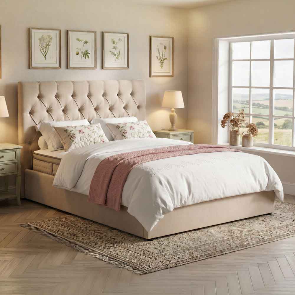 Upgrade your bedroom with the luxurious Furniture in Fashion Middleton Fabric Ottoman Storage King Size Bed in Stone. Featuring a timeless design, this bed is upholstered in soft stone-toned fabric that adds a calm and sophisticated touch to any bedroom decor. The beautifully tufted, high-rise headboard enhances the classic appeal while offering plush comfort for reading or lounging in bed. Perfect for modern living, the Middleton King Size Bed includes a spacious ottoman storage compartment, easily accessible through a smooth gas-lift mechanism. Its the ideal solution for storing bedding, pillows or seasonal items while maintaining a clean and clutter-free bedroom. Combining style, space-saving functionality and exceptional comfort, this bed is a smart and stylish centrepiece for any master suite. FEATURES : Material : Fabric Finish : Stone High-quality, neutral fabric complements a wide range of interior styles Lift-up base reveals generous under-bed storage to maximize your space Effortlessly access the storage area with a durable and easy-to-use hydraulic system Tall, plush headboard with elegant button detailing adds classic charm and support Offers ultimate comfort and room for couples or individuals who love extra space Built for durability with a reinforced frame and high-quality materials Great for storing extra linens and keeping your room organized without additional furniture Delivered with comprehensive instructions and all necessary fittings for quick setup Please note : Mattress not included Available at an affordable price Images shown are for illustration purpose only DIMENSIONS : Headboard Height : 124cm Side Rail Height : 31cm Bed Length : 217cm Headboard Width : 159cm Leg Height : 2cm Storage Dime-nsions : 203cm x 152cm x 23cm