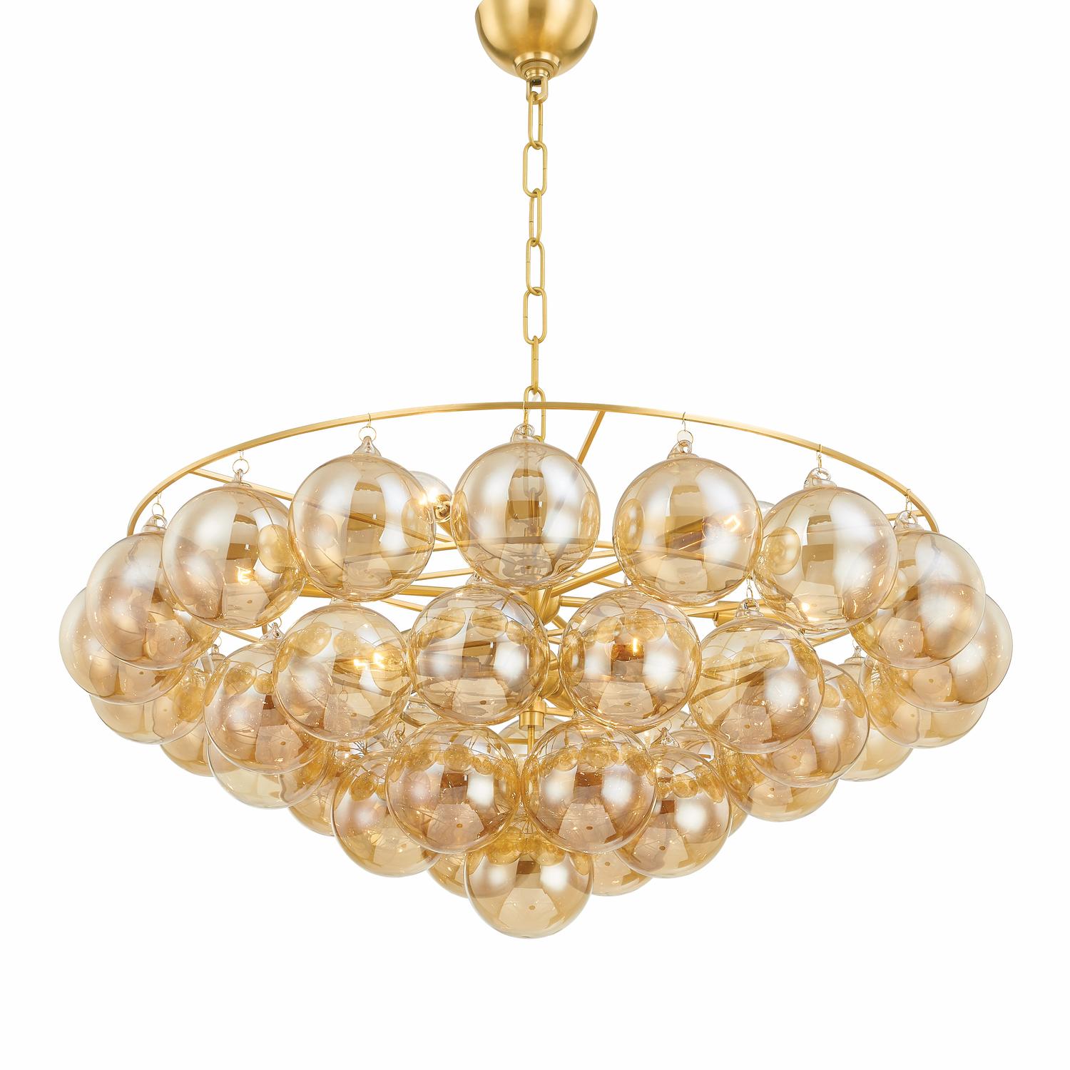 Illuminate your space with the Mimi Chandelier in Aged Brass. A cloud-like design with champagne glass globes, perfect for adding elegance and warmth to any room. Mimi, Light, Large - Andrew Martin