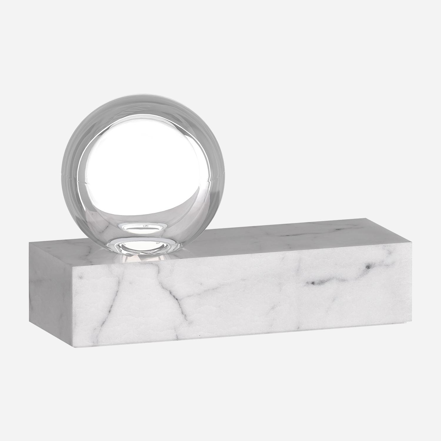 Mina table lamp by Sean Lavin features an elegant sphere of pure optic crystal, resting on a luxurious white marble base. This beautiful orb is laser-etched and further illuminated by a powerful firing hidden LED. Mina Table Lamp White, Table Lamp, White Marble - Andrew Martin