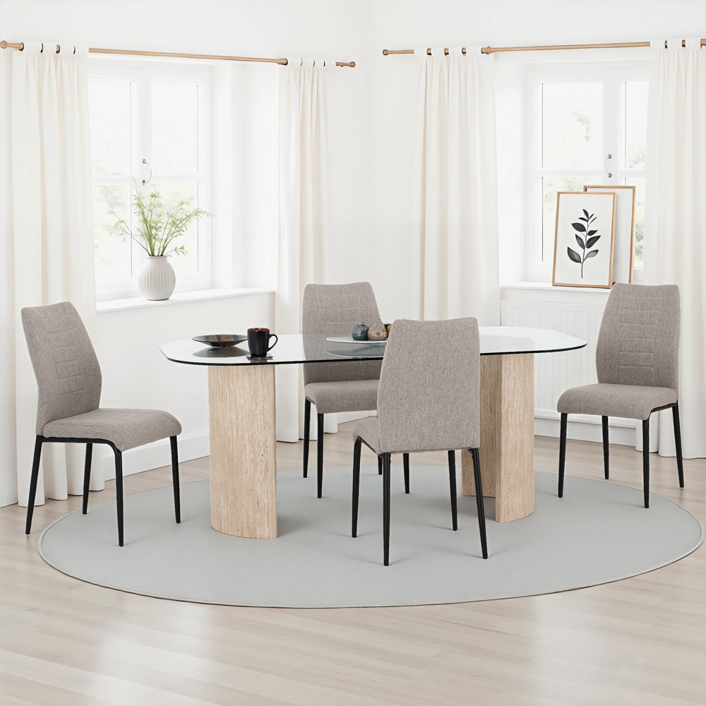 Introduce a modern touch of elegance to your dining space with the Furniture in Fashion Mirano Clear Glass Top Dining Table With 4 Cary Grey Chairs. This beautifully coordinated dining set features a sleek clear tempered glass tabletop paired with a refined cream marble-effect base, creating a light, airy feel that instantly enhances contemporary interiors. Designed to visually expand your room while providing a striking centrepiece, the tables transparent surface brings brightness and sophistication to every meal. Complementing the tables refined design are four Cary chairs finished in soft grey fabric upholstery, combining comfort with understated style. The plushly cushioned seats and neutral colour palette make this set perfect for everyday dining, relaxed breakfasts, or stylish dinner parties. Whether your home decor leans modern, transitional, or minimalist, this dining ensemble delivers both aesthetic appeal and practical performance. FEATURES: Table Material: Glass, MDF, Hollow Board, 3D Paper Veneer, Metal Rods Table Finish: Clear, Cream Marble Effect Chair Material: Velvet, Fabric, Metal Legs, Foam, Plywood, Non-Woven Chair Finish: Grey, Black Set Included: 1 x Dining Table, 4 x Chairs Eye-catching transparent surface that enhances light diffusion and modern appeal Adds a touch of refined texture and visual contrast under the glass top Four Cary chairs upholstered in comfortable grey fabric for inviting seating Plush chair padding and supportive seating ensure enjoyable dining experiences Neutral tones work seamlessly with a wide variety of interior decor styles Clean lines and minimalist details create a chic, modern aesthetic Smooth glass surface and quality fabric make everyday cleaning and care simple Built with quality materials for reliable support and everyday use Ideal for family dinners, casual breakfasts, and entertaining guests Designed with flat-pack delivery and clear instructions for quick home setup Availabl