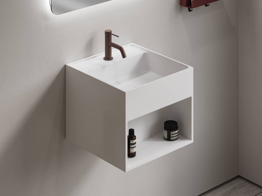 Wall-mounted washbasin in Acovi® with shelf