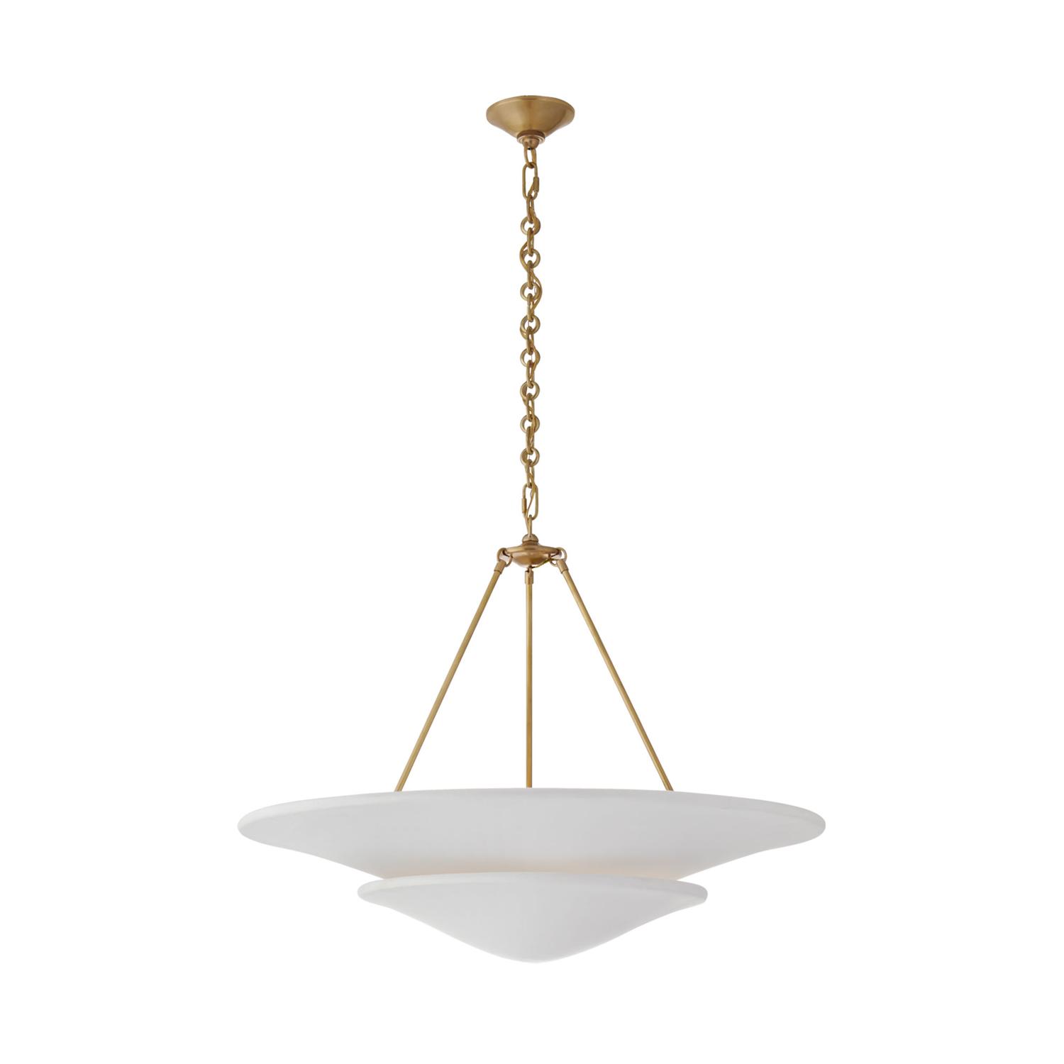 This tiered chandelier offers a modern take on traditional pendant lights. In matte white, the wide circular shade is complimented by an elegant antique brass chain to create a simple and understated ceiling light. Mollino Chandelier Brass, Chandelier, Gold/White - Andrew Martin