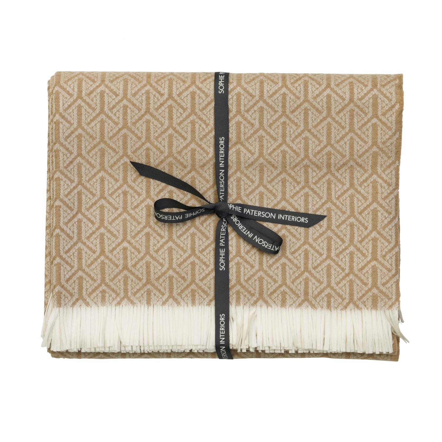 Monte luxurious throw with fringe detailing in tan Perfect for adding a chic layer to any bed, sofa or chair this soft and luxurious throw has fringed edges and was woven in Italy from 90% Merino wool and 10% cashmere. In a warm tan shade this throw features our popular Monte print, designed in collaboration with Sophie Paterson and inspired by Italy's southern Salento region. Monte Throw Tan, Throw - Andrew Martin Sophie Paterson