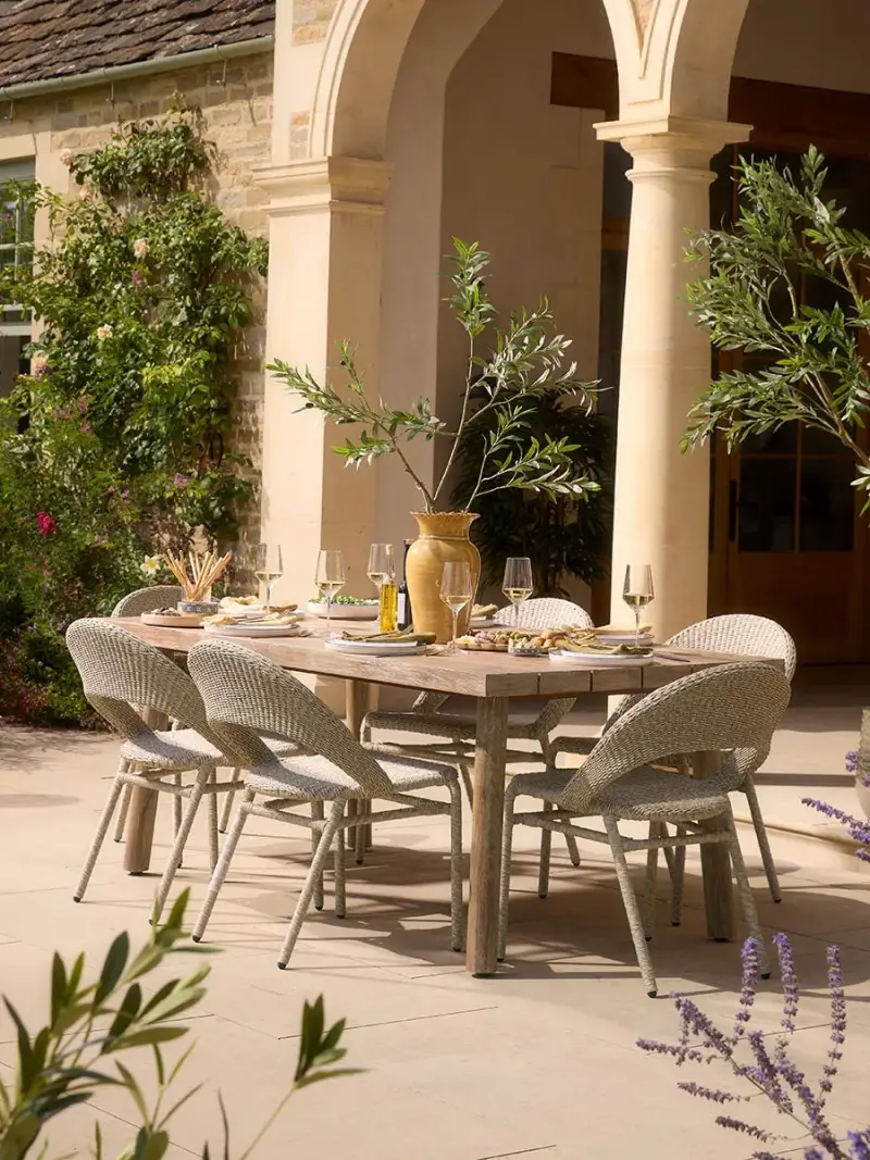 Create an elegant setting for open-air dining with our beautifully crafted Mora outdoor dining set. Combining natural tones and timeless design, the solid wooden table features a softly weathered finish that exudes relaxed sophistication, while the gently curved chairs - woven in a pale, tactile wicker - add depth and texture to the furniture set.Perfect for leisurely lunches or candlelit suppers beneath the stars, the spacious tabletop offers ample room for entertaining family and friends. The neutral palette complements any garden landscape, from sun-drenched terraces to shaded courtyards, bringing a refined yet inviting warmth to your outdoor space.Designed for comfort, durability, and effortless style, this dining set invites you to slow down and savour every moment outdoors.