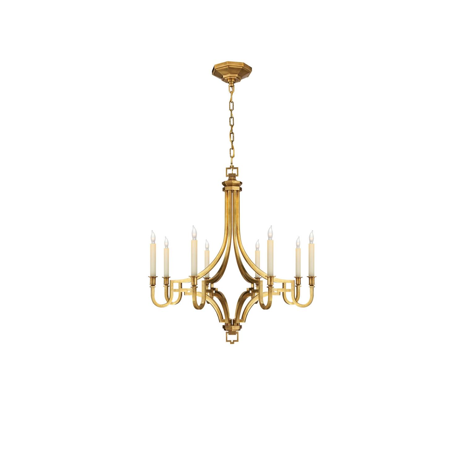 An elegant chandelier, designed by lighting industry legend, E. F. Chapman. Mykonos is perfect above a dining table or in an entrance hall. Mykonos Chandelier Brass, Chandelier, Antique-Burnished Brass - Andrew Martin