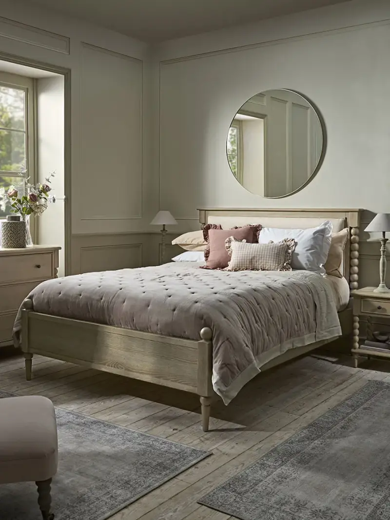 Create a restful sanctuary for you to curl up into and enjoy a peaceful night's sleep with our Namur King Size Bed. Crafted from a light-washed wood, a traditional frame is enhanced by beaded legs that build to the top of the headboard, and finished with a neutral headboard that provides a touch of comfort to the frame. Its timeless appeal makes it the perfect addition to our Faded Elegance trend.