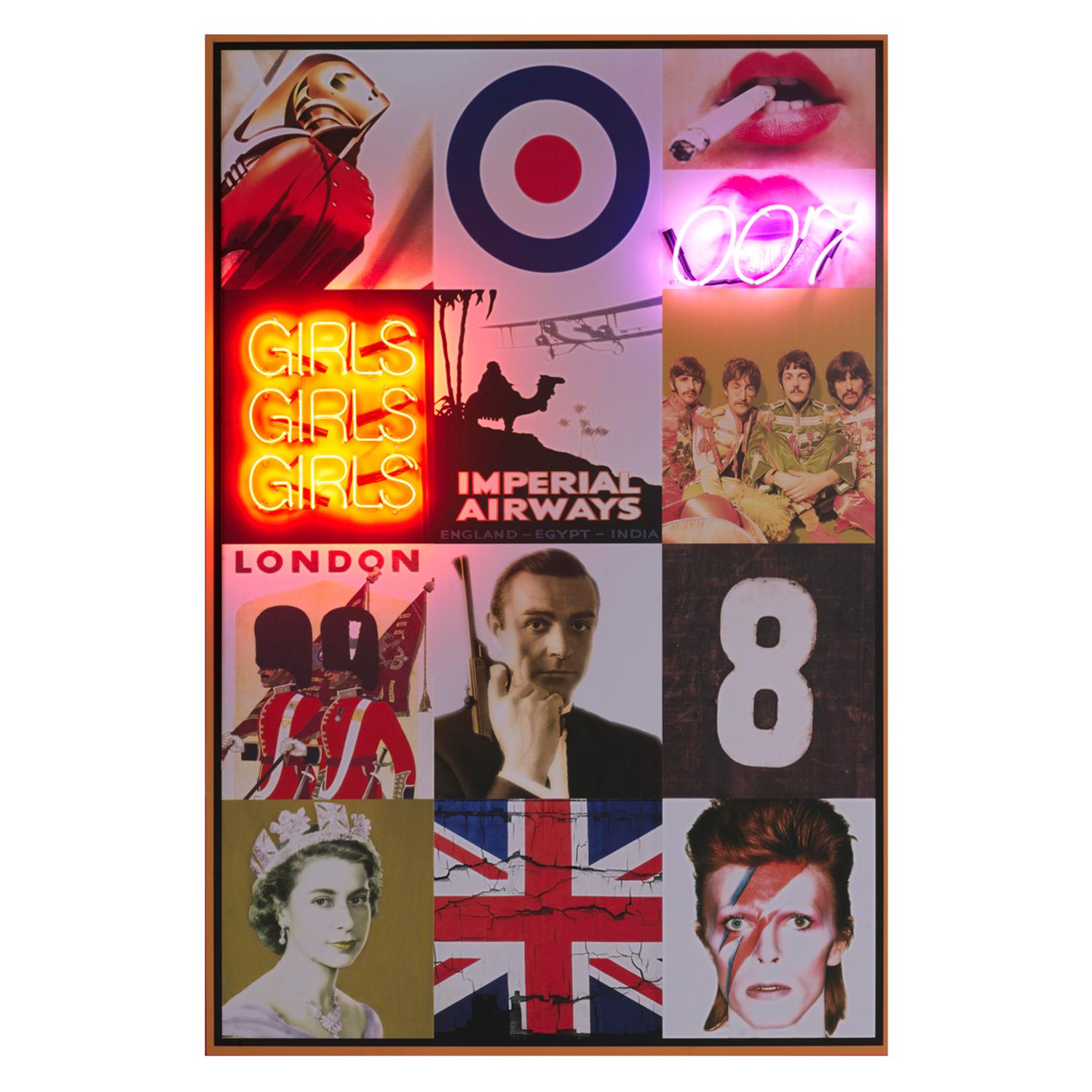 The Queen, James Bond and The Beatles, you can't get much more iconic than this. This fun British posterboard has been printed onto aluminum and mounted onto board, with added flair from the orange and pink neon lights. Neon - Britain 80X120, Neon Artwork, 80cm x 120cm, Multicoloured - Andrew Martin