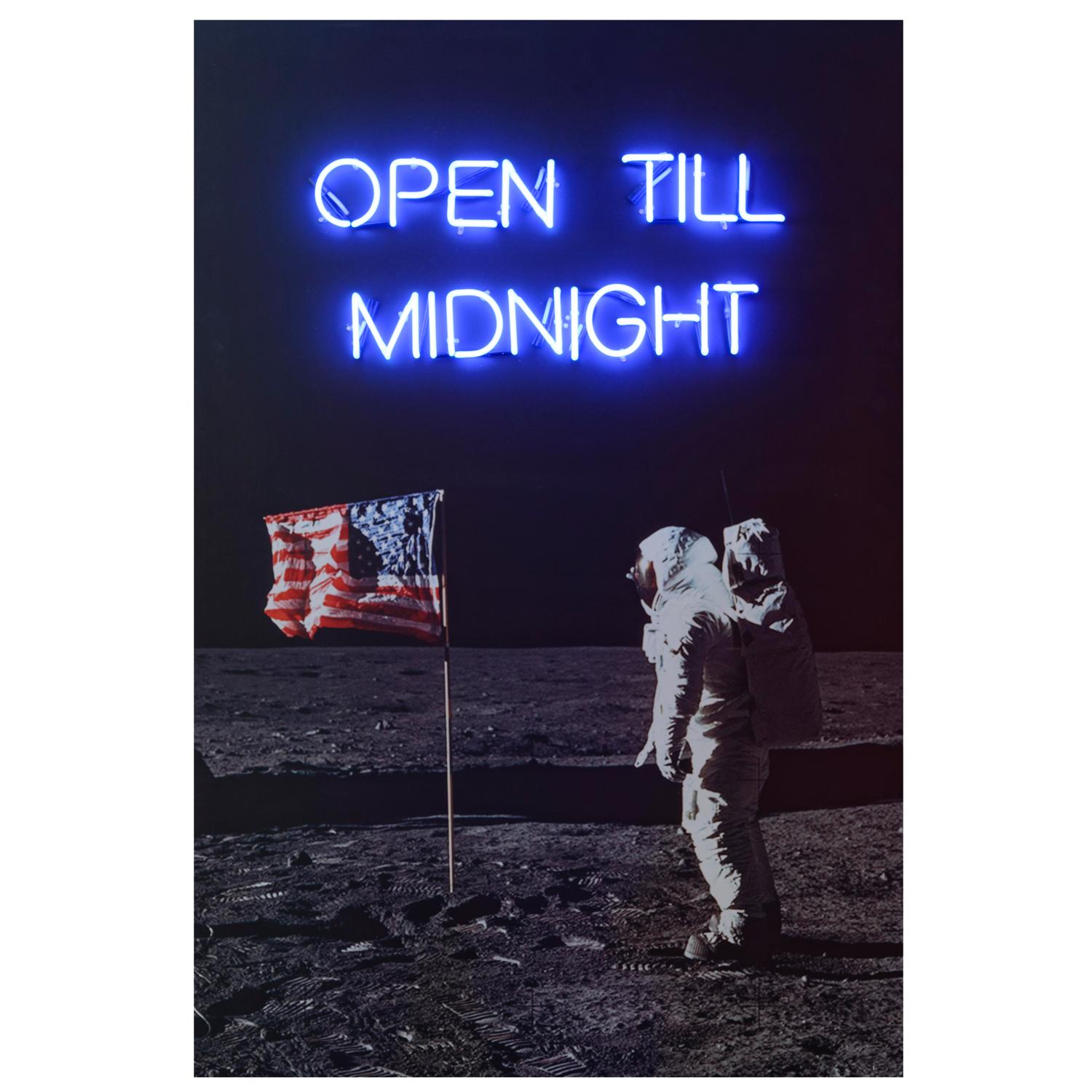 The words 'open till midnight' are illuminated in neon blue above a photographic image of the first man on the moon in this uber cool artwork. Printed onto an aluminum sheet and mounted onto board the artwork appears as if it's floating when hung against the wall. Radiating stand-out cool, this is a must-have for a modern living room, kitchen or games room, and will look uber cool contrasted with an older property. Neon - Moon Landing 80X120, Neon Artwork, 80cm x 120cm, Blue - Andrew Martin