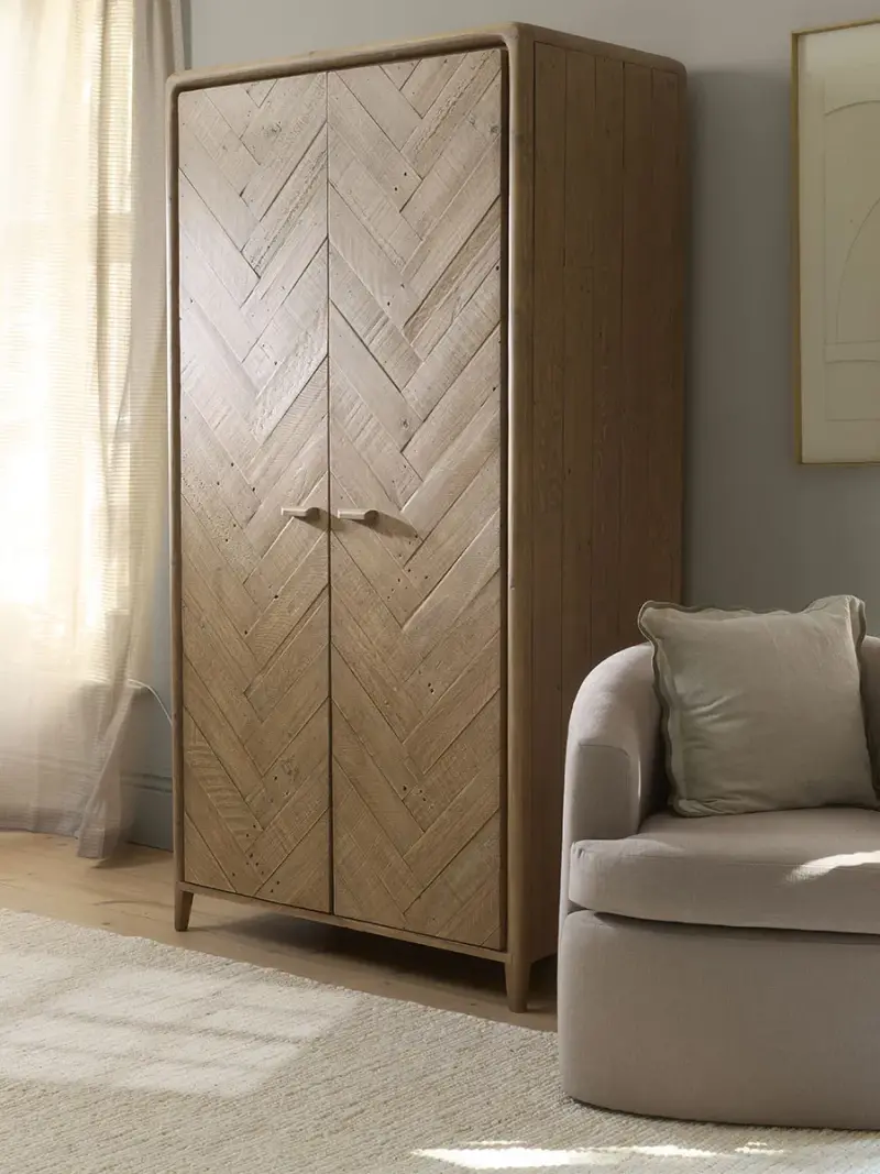 Crafted from reclaimed timbers, this wardrobe has a solid frame that is softened by curved corners and tapered legs.The wardrobe is fronted with parquet-style doors, and they are finished with wooden handles that create a simplicity to the frame.With a rod for hanging and two shelves that offer plenty of room to keep items folded away neatly, pair this wardrobe with the rest of our Nils collection, including a bedside table and a chest of drawers.