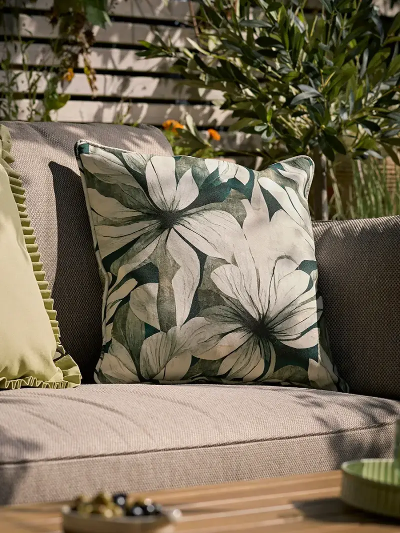 Inspired by the quiet beauty of evening blooms, our Noctiflora Outdoor Cushion introduces a sense of refined drama to your outdoor setting. The bold floral print, in layered tones of deep green and soft cream, evokes the serenity of dusk in full bloom.Crafted from shower-proof and UV-resistant polyester, it's designed to retain its elegance through every season, from bright summer afternoons to candlelit evenings outdoors.A luxurious addition to any terrace or garden retreat, this cushion transforms everyday seating into a space of calm, character, and effortless sophistication.