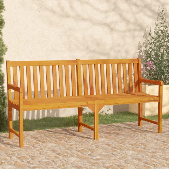 The classic outdoor bench, made of solid acacia wood, is weather-resistant, highly durable and suitable for outdoor use. The oil-finished surface makes the bench easy to clean with a damp cloth. The armrests and backrest offer great support and also add to the bench's seating comfort. FEATURES : Material : Solid Acacia Wood with An Oil Finish Finish : Natural Colours and grains vary from piece to piece, making each piece unique; the delivery is random In order to extend the life of your outdoor furniture, we recommend you to clean it regularly and do not leave it outdoors without protection unnecessarily Use a mild soap solution If possible, store in a cool, dry place indoors If the product is stored outdoors, protect it with a waterproof cover Wipe and dry the excess water or snow from flat surfaces after a rain or snowfall Allow sufficient air circulation to avoid moisture-related damage Assembly required: Yes Available at an affordable price Images shown are for illustration purpose only DIMENSIONS : Height : 90cm Width : 180cm Depth : 55. 5cm Seat Width : 174cm Seat Depth : 42. 5cm Seat Height from the Ground : 45cm Armrest Height from the Ground : 66cm