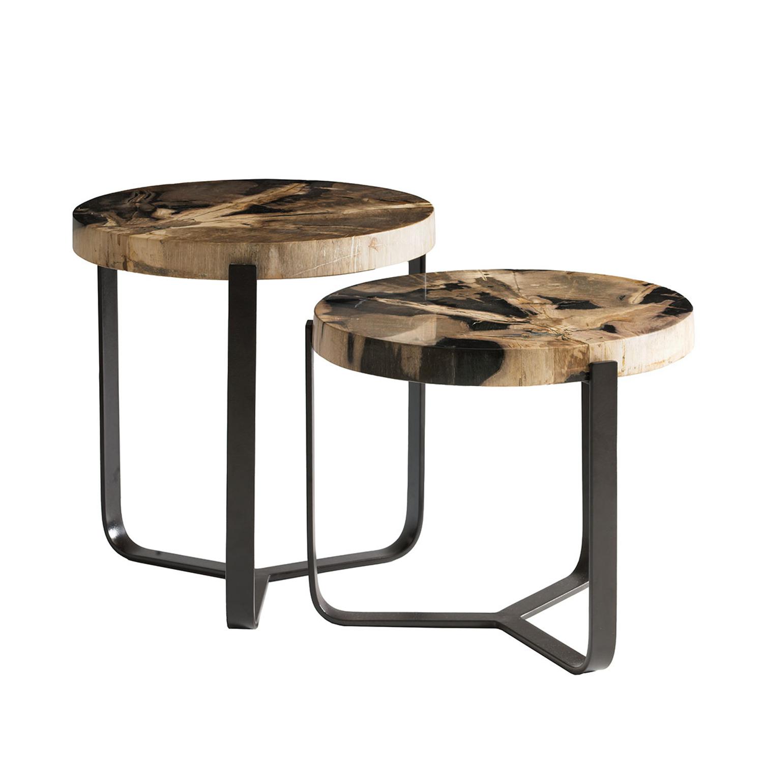 Nova is a set of two nesting side tables, ideal as use as a set or seperate into different areas of your home. The wrought cast iron tripod style legs are topped with a chunky slab of petrified wood bringing a graphic, natural element to any space. Due to the organic nature of the petrified wood top, each piece will vary in appearance. Nova Nesting Side Tables, Nesting Side Tables - Andrew Martin