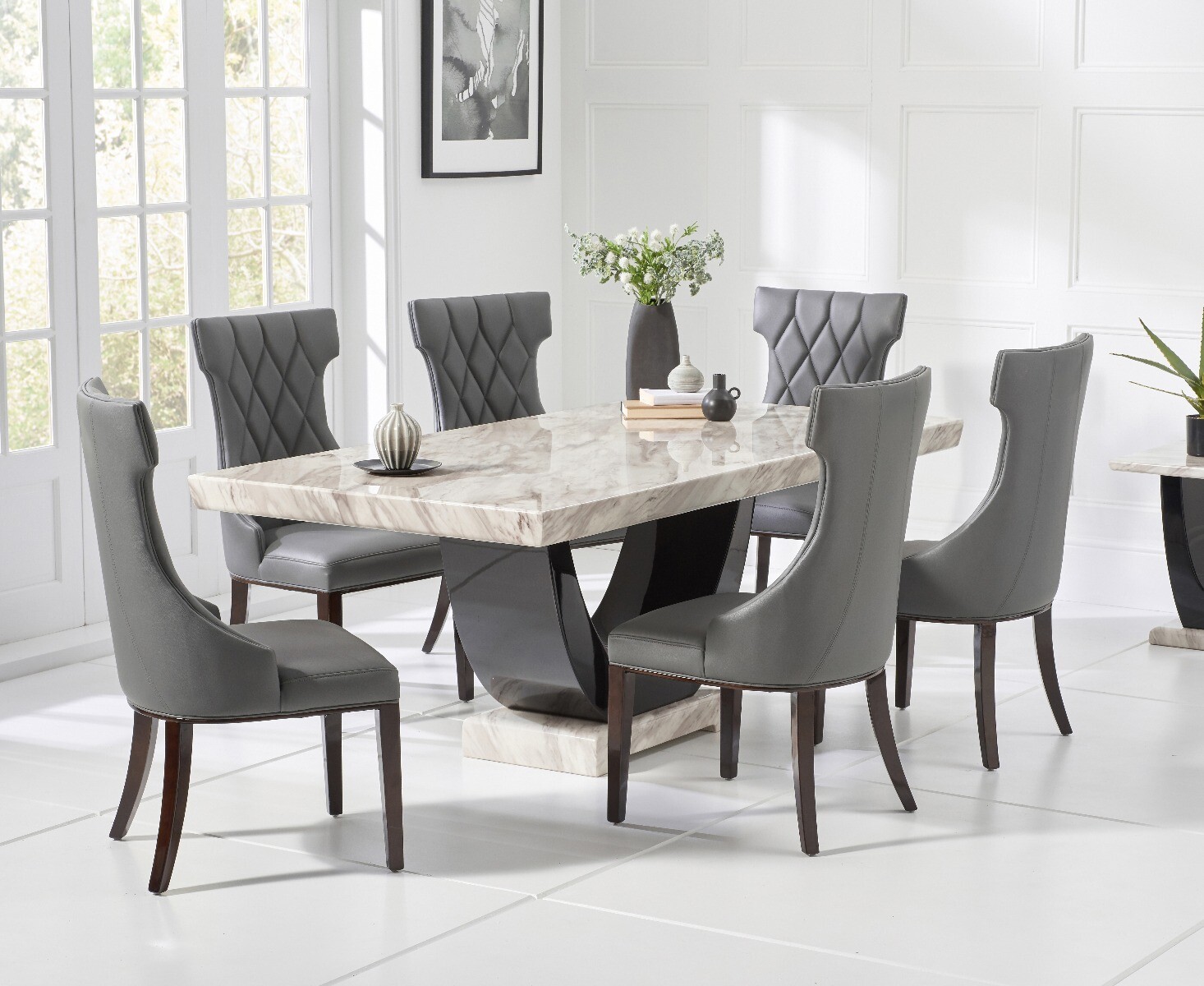 Novara 170cm Cream And Black Pedestal Marble Dining Table With 4 Grey Sophia Chairs