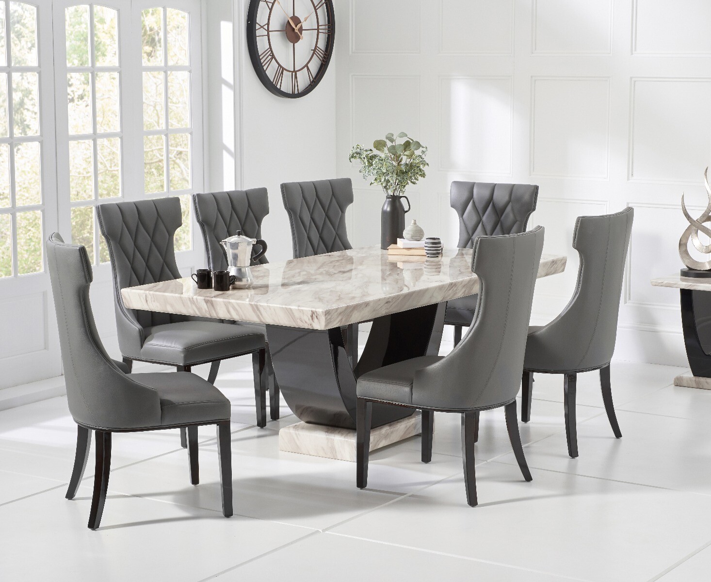 Our review of the Novara 200cm Cream And Black Pedestal Marble Dining Table With 8 Grey Sophia Chairs