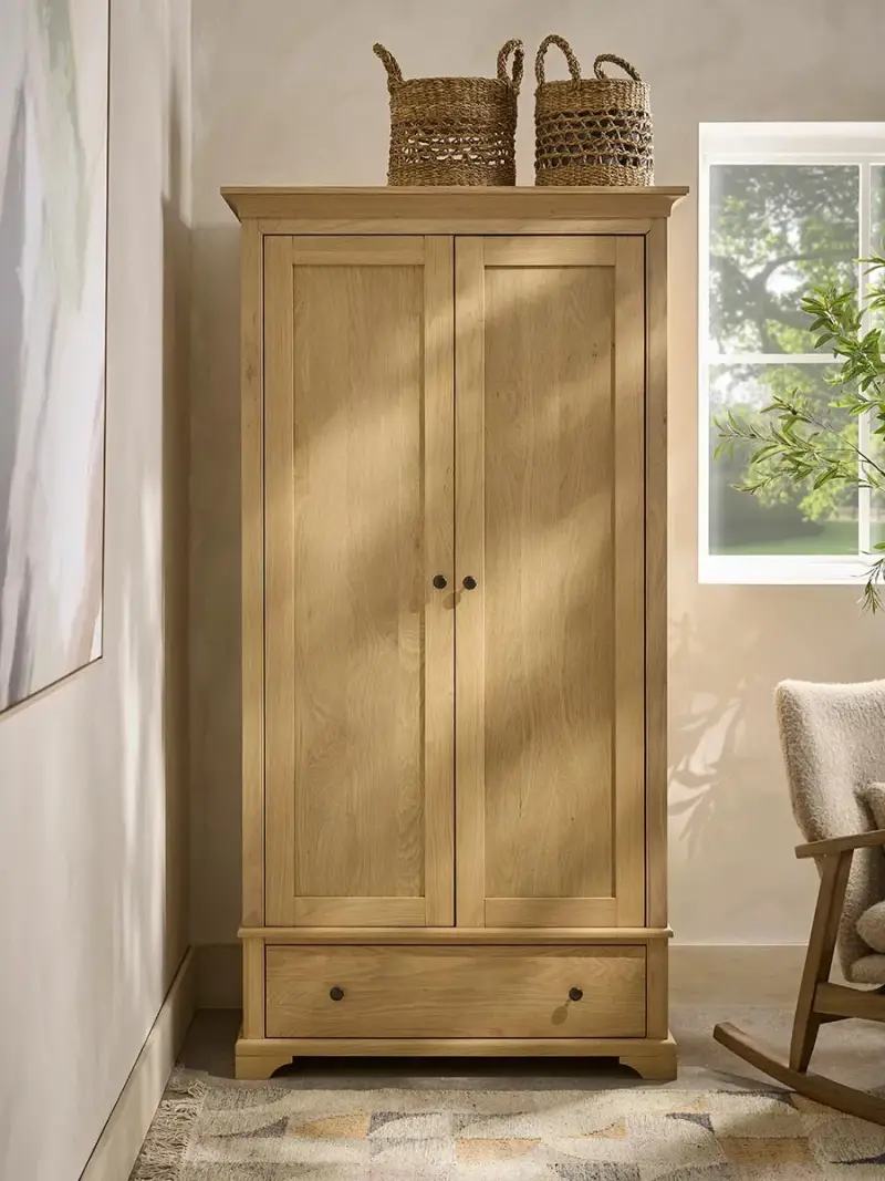 Introduce timeless craftsmanship and natural warmth to your bedroom with our Oak Wardrobe.Beautifully built from solid oak with a softly grained finish, it brings a calm, refined presence to your space. Inside, a full hanging rail and generous shelf provide practical storage for clothing and accessories, while the spacious bottom drawer keeps everyday essentials neatly tucked away.Perfect for master bedrooms, guest rooms or dressing spaces, our Oak Wardrobe offers enduring style and thoughtful functionality.