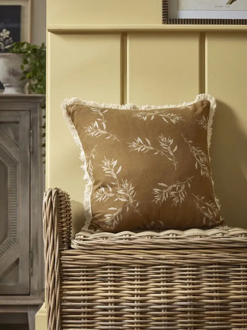 In beautiful mustard yellow tones, this cushion adds a welcome spot of colour to your home.With a delicate olive leaf print standing out from the background, this cushion is finished with a petite tassel trim creating a relaxed feature that adds to the rustic charm of this cushion.