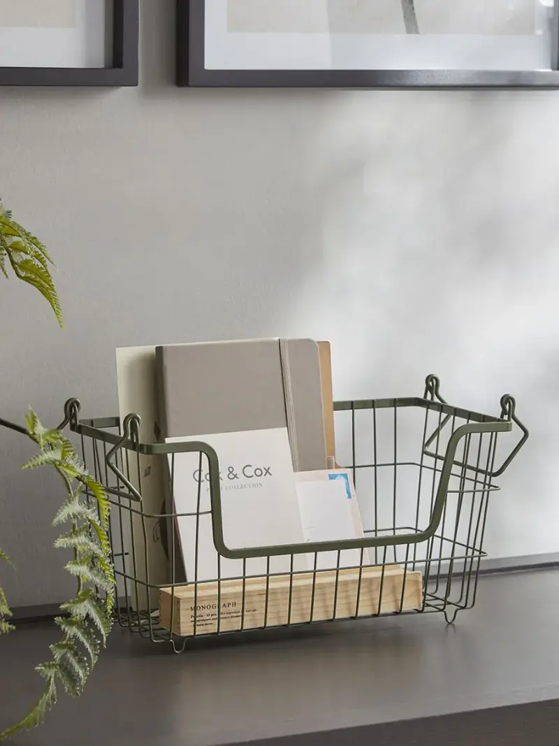 For an industrial style storage solution, our wire basket creates a modern storage solution that is sure to work with a contemporary scheme.The iron frame is complemented with an olive green tone, adding softness to the basket.Handles on each side make it easy to move, and its deep lip at the front allows everyday items to be accessed easily. Also available in a larger size.