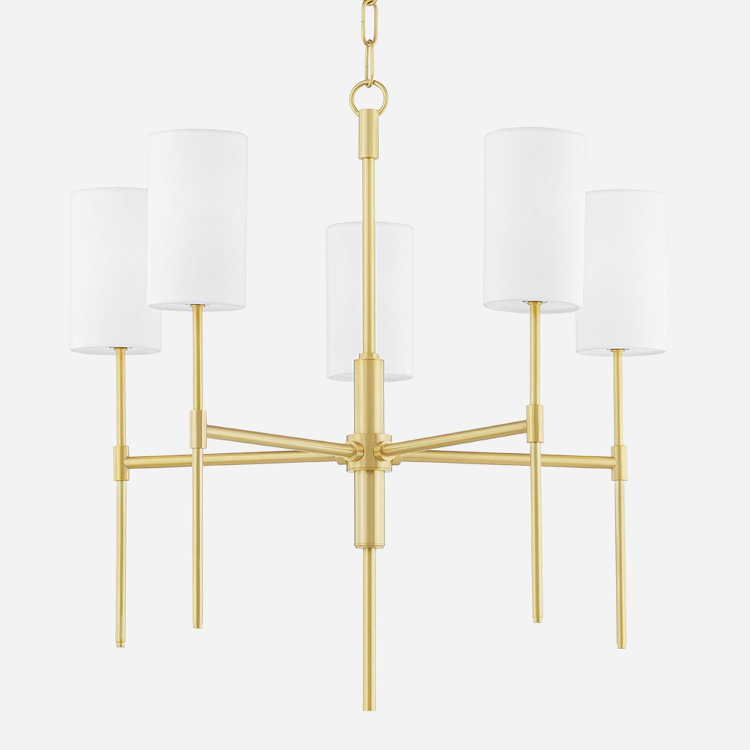 Traditional style with an edge, Olivia's long metal arms extend down giving the piece a torch-like feel. The Belgian linen shades cast a candle-like glow instantly soothing any space. Olivia Chandelier, Chandelier, Brass - Andrew Martin