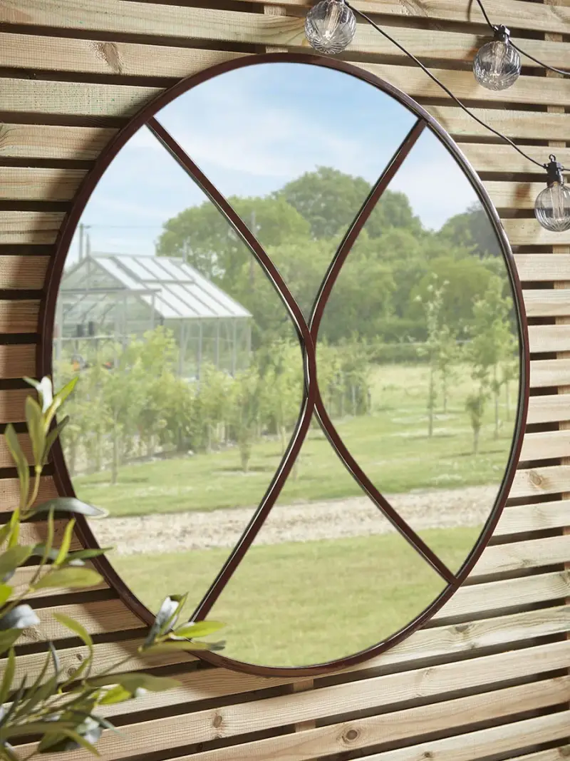 Our geometric outdoor mirror has a natural bronze frame, creating a laid-back and rustic appearance.Simple and elegant, this mirror creates depth reflecting the natural beauty of your space.