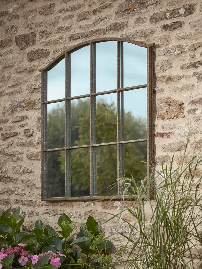 A striking addition to a brick or stone exterior wall, this panelled window mirror has a lovely aged industrial look and will gently extend the visual reach of your outdoor space.