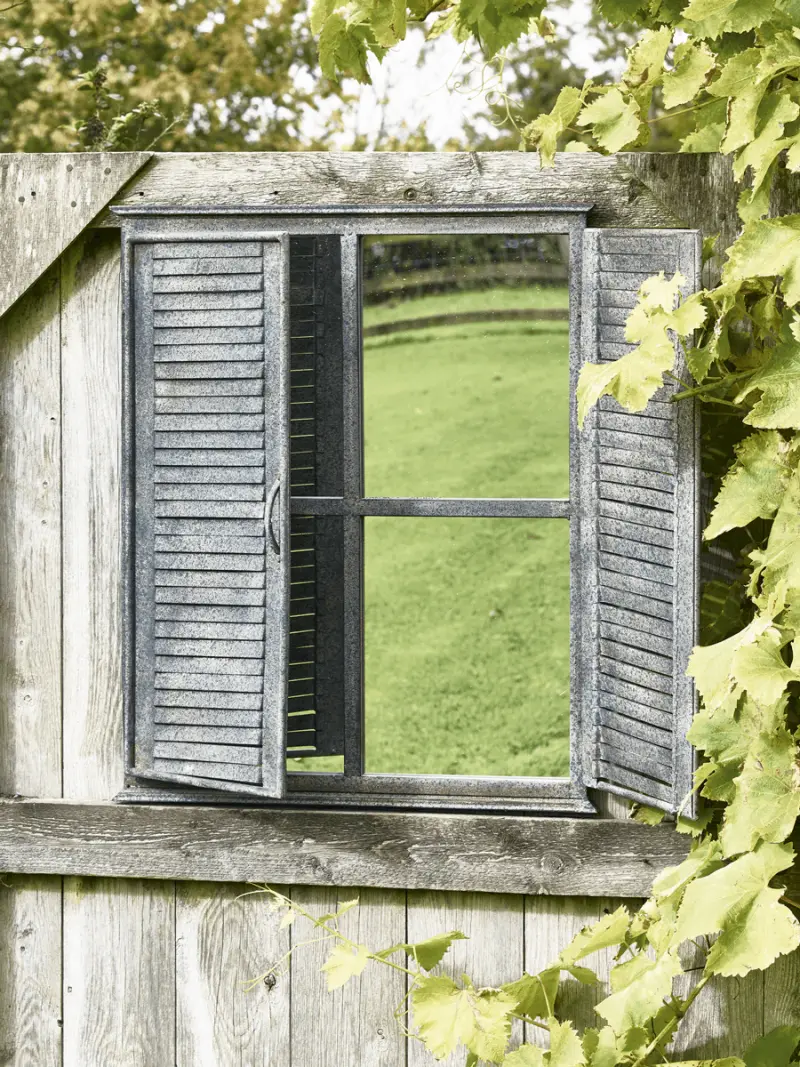 Reminiscent of traditional French windows, our large vintage style window mirror has been made from iron with a distressed painted finish. Each mirror includes a pair of hinged metal shutters with a rustic distressed finish and two handles for opening and closing. With four hooks on the reverse for hanging, this clever mirror can be used to create the illusion of space and will look just like an old window.