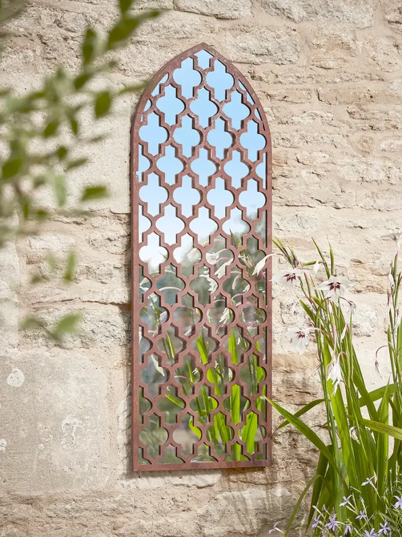 Bring a little corner of Morocco to your garden with our ornate Trellis Mirror. Designed for outdoor use, the richly tarnished frame forms a traditional quatrefoil grill pattern, opening up additional vistas and framing the views from your garden, big or small.