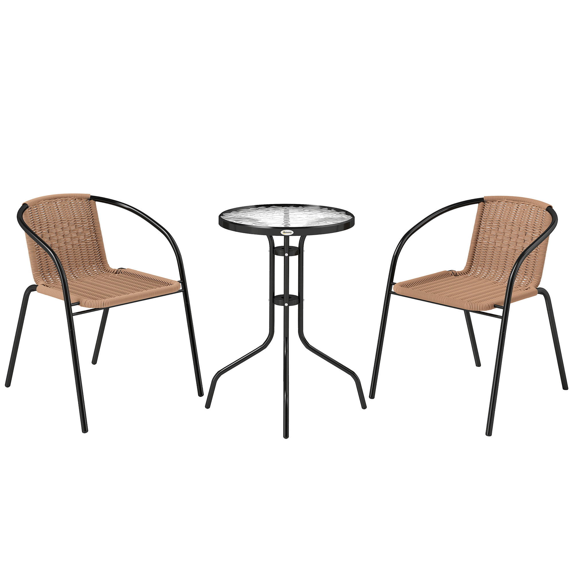 Create your personal oasis with our Outsunny garden furniture set! This garden bistro set features two trendy leisure chairs and a stylish tempered glass tea table, making it great for relaxation and socializing. Each chair is adorned with a wide seat, firm backrest and armrest, providing a cosy seating experience. Elevate your outdoor space with these bistro table and chairs, adding a touch of fun and leisure to your everyday life. Experience serenity and style like never before!Features:Made of steel frame with a powder-coated finish, wrapped in weather-resistant PE rattanChair can be stacked to save space when not in use5 mm glass tabletop for durability and easy cleaningAdjustable foot pads keep this set stable on uneven floorHandwoven rattan, adds aesthetic to your gardens and balconiesGreat for balcony, terrace and gardenAssembly required