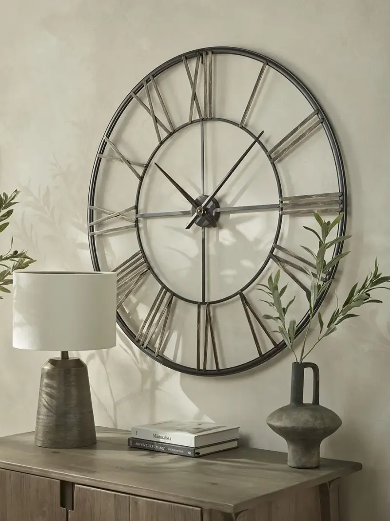 Crafted from a sturdy iron, this wall clock has a slightly weathered finish to it adding some rustic charm to your home.With cut out roman numerals and simple hands, this weighty skeleton clock can be easily hung, but looks just as good propped against a wall or on a console table.