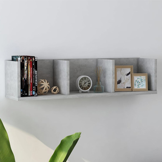 Pacorro Wooden Wall Shelf With 3 Compartments In Concrete Effect, Keep all your precious CDs or DVDs safe and sound in this commodious CD wall shelf. Stylish and practical, it is perfect for keeping your music collection organised. FEATURES : Material : Engineered Wood Finish : Concrete Effect Three open compartments not only offer plenty of storage space to hold records, but also are ideal for holding any accessories for your collection Made of strong engineered wood, the storage cabinet is exceedingly sturdy and durable The CD shelf is easy to clean and mount to the wall A great storage solution for keeping your home organised, this DVD shelf is just what you need! Numbers of storage compartment : 3 Screw and plug for inside the wall are not included Seek and use screw and plug suitable for your walls If you are uncertain, seek professional advice Read and follow each step of the instruction carefully Available at an affordable price Images shown are for illustration purpose only DIMENSIONS : Height : 18cm Width : 75cm Depth : 18cm
